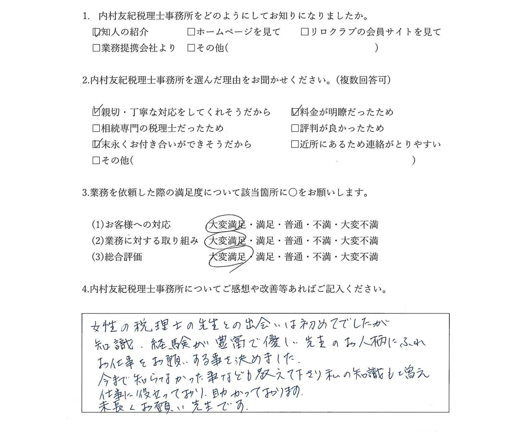 父の急逝により内村会計事務所さんにお世話になりました。実績豊富なこと、評判も良かったこと等々 考えて内村会計事務所さんに決定いたしました。担当の内村さんに大変お世話になりアフターフォローにも感謝しております。